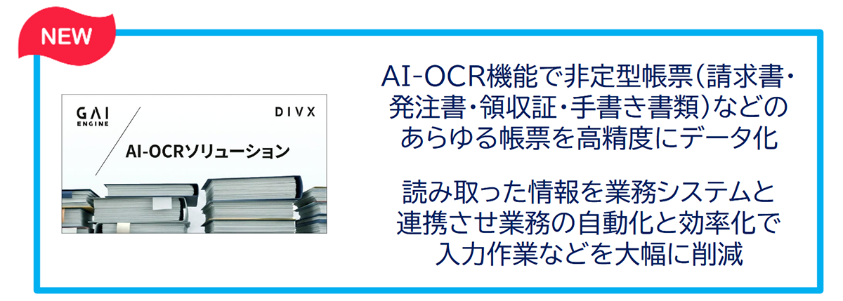 「GAIエンジン」は子会社の株式会社divxが提供する、複数AIと業務システムの連携管理プラットフォームです。AI導入時に立ちはだかる「既存システムとの接続」や「運用体制の整備」などの課題を解決し、開発工数やコストを抑えて導入スピードを飛躍的に高め、現場の業務にフィットするAIを迅速に構築します。