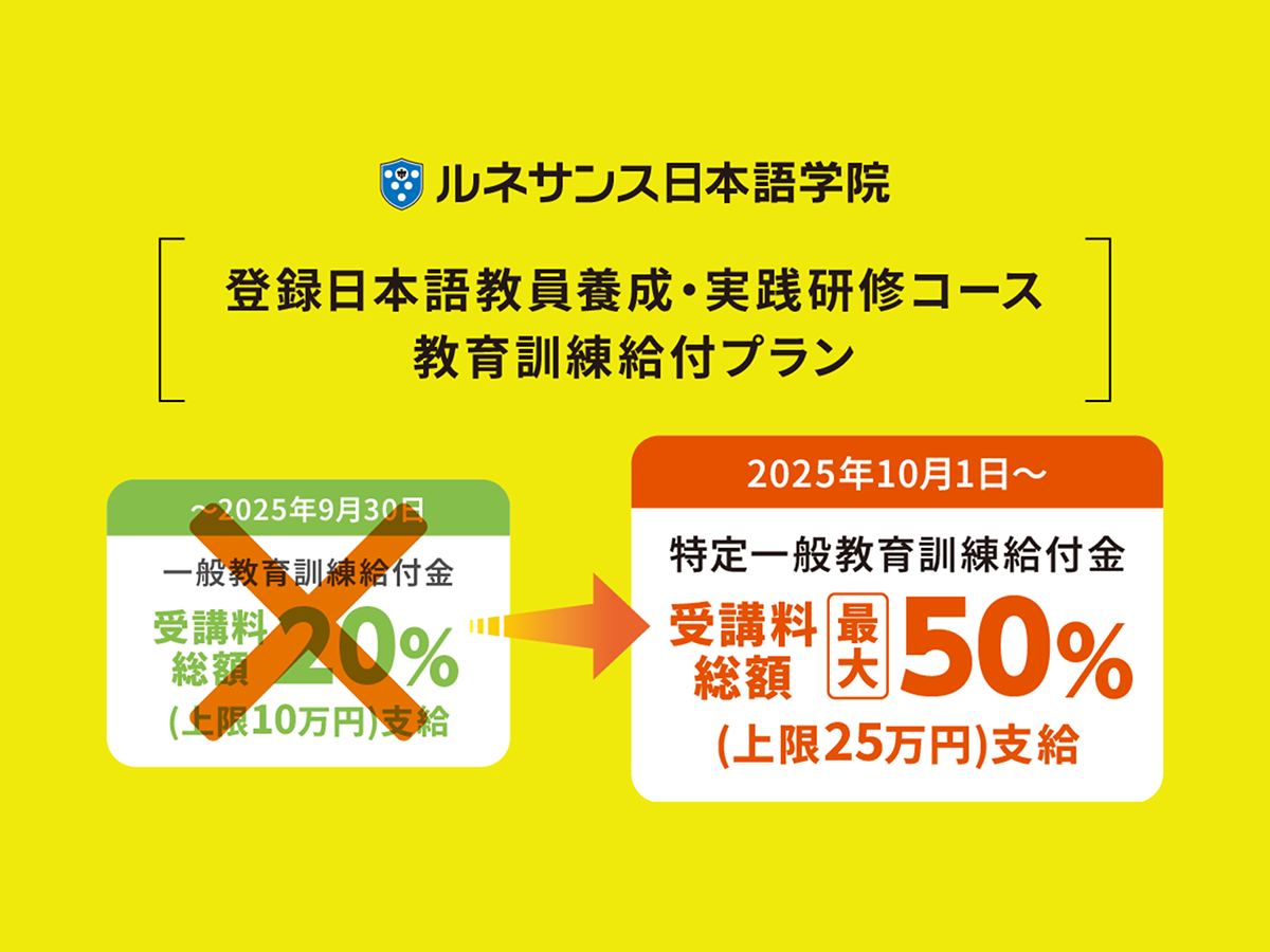 「日本語教師養成講座(登録日本語教員養成・実践研修コース)」が、厚生労働省の教育訓練給付制度における「特定一般教育訓練」の指定講座になりました。当講座はこれまで、受講費用の最大20%が支給される「一般教育訓練」の指定講座でしたが、2025年10月から受講費用の最大50%が支給されることになり、さらに受講しやすくなりました。